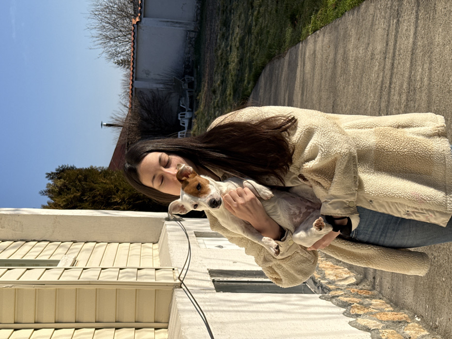 The scene depicts a female subject and a dog outdoors in Galabovtsi, Bulgaria, under bright daylight. A female with long, dark hair, wearing a cream-colored sherpa jacket and blue jeans, stands holding a small white dog with brown patches on its right ear and around its left eye. Her eyes are closed, and her left hand supports the dog's chest while her right hand is near its midsection. The dog faces forward, looking slightly to the right of the viewer. To the left, a two-story building features light-colored horizontal siding on its upper portion and a stone-clad facade on its lower section, with a visible window. A concrete pathway curves from the lower left towards the right, separating the subjects from a patch of green grass. The background includes a low white wall topped with terracotta tiles, various trees (one dark evergreen, others deciduous with bare branches), and a clear blue sky. White outdoor chairs or loungers are visible on the grass in the mid-ground. Long shadows are cast across the ground, consistent with direct sunlight.