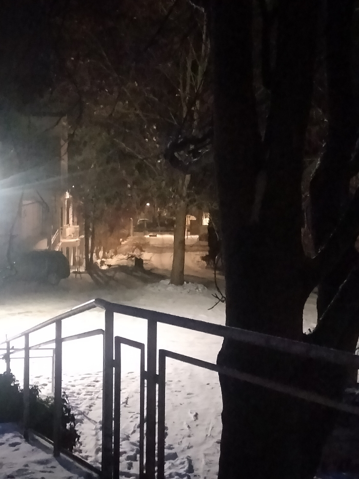 A snowy night scene depicts a residential area. Snow covers the ground, partially obscuring a road and parked cars. A building is visible to the left, illuminated by a street lamp. Trees, silhouetted against the night sky, stand along the road. A railing with a modern design is in the foreground, partially covered in snow. A large tree trunk occupies the right side of the frame, its branches reaching upward.