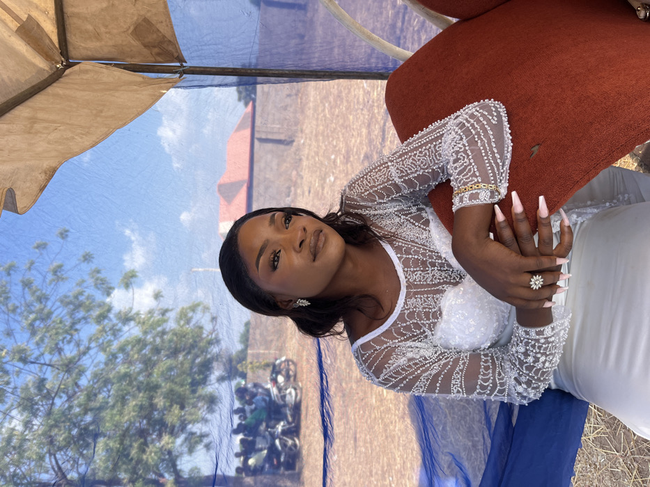 The scene is an outdoor daytime setting in Unknown, Nigeria. A young adult female with dark hair and complexion is centrally positioned, seated and looking towards the right of the frame with a neutral expression. She wears a white, long-sleeved gown featuring extensive white beadwork and sequins, with a sheer upper and opaque, sequined bodice. She has silver-toned dangling earrings, a gold-toned bracelet on her right wrist, and a large, multi-petaled ring on her right ring finger; her fingernails are long and painted light pink. She rests her hands on a reddish-orange cushion, which is likely part of an outdoor chair or bench. A blue mesh netting is visible in the foreground, suggesting a canopy or tent enclosure, part of which is visible as a light-colored fabric structure in the upper right. The background features a large green-leafed tree on the left, beneath a clear blue sky with scattered white clouds. Below the tree, a group of approximately five to seven individuals, mostly males, are partially visible near two motorcycles. The ground is dry, light-brown earth. In the mid-distance to the right, a low wall or fence precedes a building with a reddish-orange pitched roof.