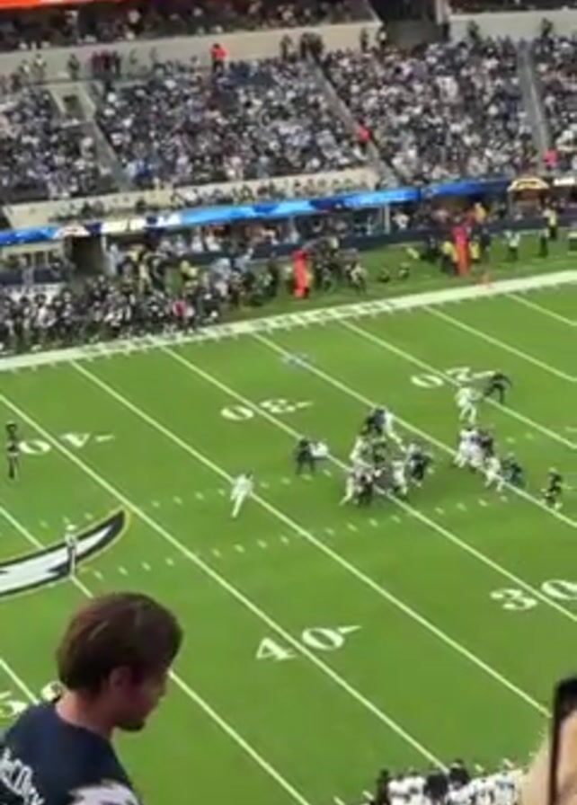 n American football game being played in a stadium, shot from a high vantage point in the stands. A group of players in black and white uniforms are actively engaged in a play on the green field, while another player in white stands nearby, appearing to survey the field. The field is marked with white yard lines and numbers. The stands are filled with spectators, many wearing team colors, creating a dense crowd. Foreground elements include the back of a man wearing a blue Chargers jersey and a woman with blonde hair. The overall atmosphere is energetic and focused on the ongoing game.