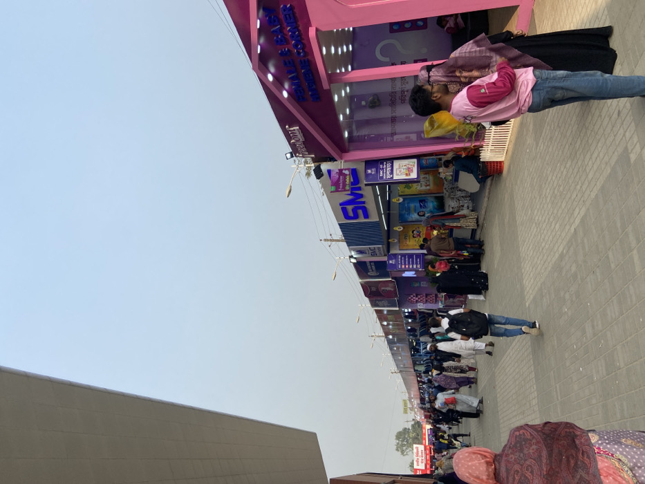 This image depicts an outdoor market or exhibition located in Kanchon, Bangladesh, under a clear, light blue sky. A wide, paved walkway constructed from rectangular bricks extends from the foreground into the background, flanked by numerous commercial booths on the right. On the immediate right, a prominent, brightly lit pink booth features the sign "FEMALE & BABY HYGIENE CORNER" in blue lettering. A white picket fence section is visible in front of this booth. Adjacent to it, a blue-fronted booth displays "SMC" and "Freedom" branding. Further down the path, a continuous line of similar booths with various signage, including more "SMC" logos, extends into the distance. These booths are internally lit and display merchandise. Overhead streetlights are mounted on poles along the path. An architectural overhang, possibly part of a larger structure or canopy, is visible in the upper left corner. Approximately two dozen individuals are present on the walkway. In the foreground on the right, a male in a pink long-sleeved shirt and blue jeans stands facing left, next to a person in a black abaya and patterned hijab facing right, near the pink booth. In the far left foreground, the back of a person wearing a patterned reddish-brown head covering and sari is visible, moving away from the camera. Towards the middle of the path, a person in a white shirt, blue jeans, and a black backpack walks away from the camera. Other individuals, dressed in a mix of traditional and contemporary attire, including hijabs, saris, and western clothing, are seen walking along the path or standing near the booths. A few red plastic crates are visible near one of the central booths. The scene appears to be active with foot traffic during daylight hours.