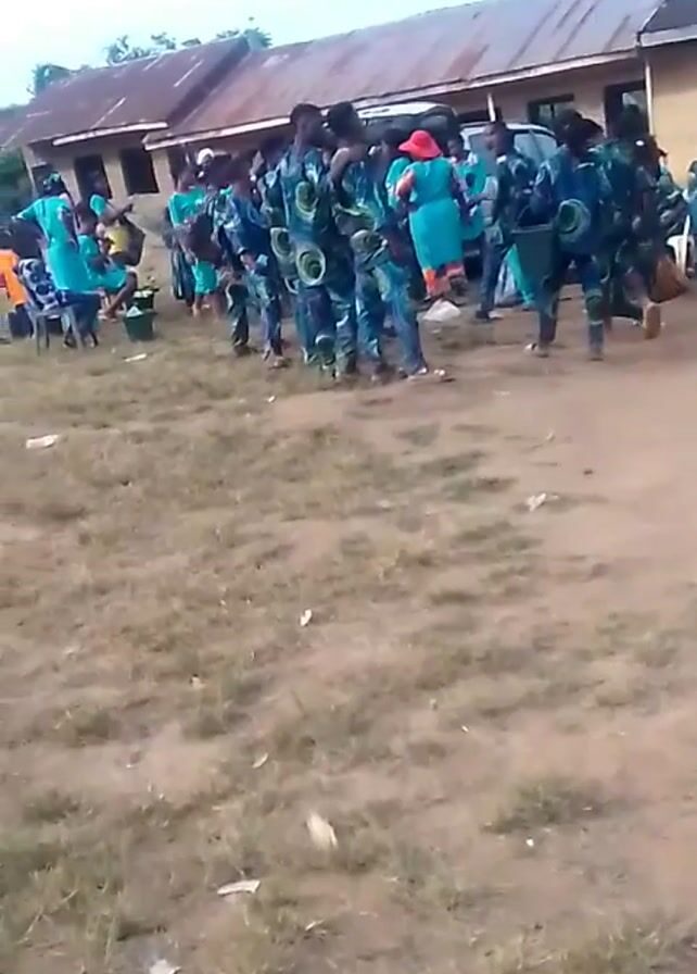 group of people standing in a grassy area in front of a building. Many of them are wearing matching blue and green patterned outfits. Some are carrying buckets. There are some chairs and a car in the background. The sky is overcast.