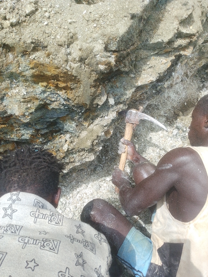 Two individuals are engaged in manual excavation at a site in Otulu, Nigeria. The environment consists of a light-colored, granular earth or rock formation, interspersed with stratified layers of darker, oxidized material displaying blue-gray, brown, and ochre tones. In the midground, on the right, an individual with dark skin, wearing a light-colored sleeveless tank top and light blue shorts, is actively using a pickaxe. Both hands grip the wooden handle of the pickaxe, its rusty metal head positioned against the layered rock face. The individual's exposed skin and clothing are dusted with light-colored particulate matter. In the foreground, on the left, a second individual, also with dark skin and short, dark curly hair, is positioned with their back partially to the camera. They wear a light-colored garment, possibly a blanket or towel, patterned with black stars and stylized text, covering their back and shoulders. This individual appears to be kneeling or sitting on the ground, facing the same direction as the pickaxe user, observing the excavation or awaiting their turn. Both individuals are close to the working face of the earth/rock.