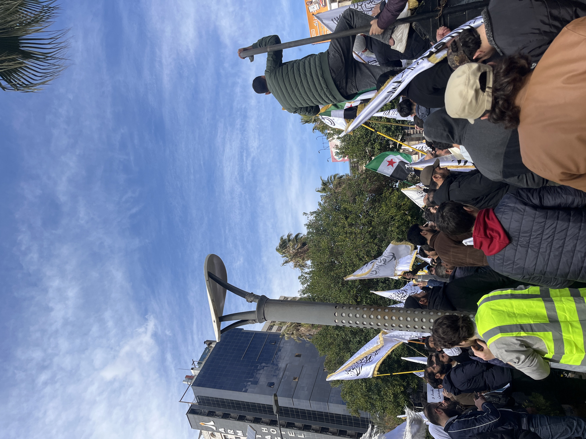 This image depicts a crowded outdoor gathering in As-Salihiya Municipality, Damascus, Syria, under a blue sky with scattered wispy clouds. The foreground and midground are filled with numerous individuals, predominantly male, standing closely together. Multiple white flags emblazoned with black Arabic calligraphy are prominently displayed throughout the crowd, along with at least one Syrian opposition flag (green, white, black stripes with three red stars). A man in a green puffer jacket and dark pants is visible from behind, elevated on a dark platform in the midground right, holding a metal pole. Another individual in the immediate foreground wears a bright yellow reflective safety vest. In the midground left, a tall, modern street light with a gray, cylindrical, perforated pole and a light-colored, flat, curved top is centrally positioned. Behind the crowd on the left, a multi-story building with dark reflective windows, identifiable as part of the Al Armash Hotel, stands tall. Green trees and palm trees are visible between the buildings and the crowd, and a billboard with orange elements is partially visible in the upper right background.