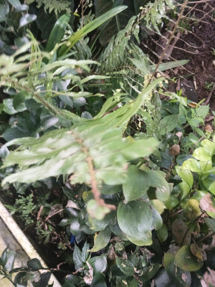 The image displays a close-up view of dense, verdant foliage and undergrowth, situated in Kon Tum, Vietnam. The scene is dominated by various green plant species. A long, light-green leaf, possibly part of a fern, is prominent and out of focus in the immediate foreground, running diagonally from the lower center towards the upper left. A thin, reddish-brown stem extends across the lower portion of this leaf. The background consists of numerous layers of diverse green leaves, including broadleaf plants and more delicate, serrated fronds. Patches of dark brown soil are visible between the plants, primarily in the upper right quadrant. A blurry, light-colored edge, consistent with a planter or pathway, is partially visible along the bottom left. No individuals, animals, or specific man-made objects are discernible within the dense vegetation.