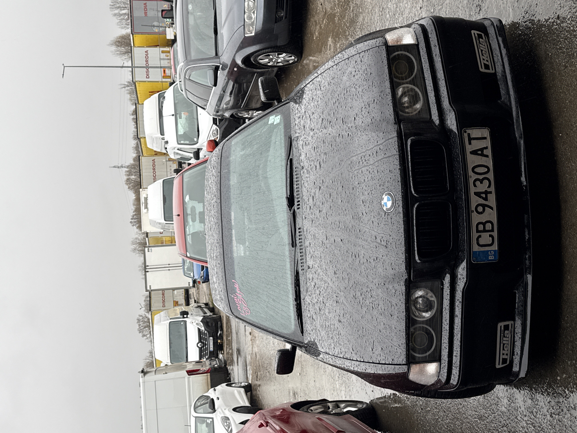 The image depicts an outdoor parking area in Busmantsi, Bulgaria, under an overcast sky with wet ground conditions suggesting recent or ongoing rain. In the immediate foreground, a black BMW 3 Series (E36 generation) is parked, facing the viewer. The vehicle's hood and windshield are covered in water droplets. It features a Bulgarian license plate "CB 9430 AT" on the front bumper. Two "Hella" stickers are affixed to the lower front bumper, one on each side. The headlights have custom projector lenses with "angel eye" rings. A pink decal, appearing to read "Loud & Slow," is applied to the upper portion of the windshield. To the left of the BMW, the front-left quarter of a red car is visible. To the right, a dark grey Audi A4 B6 Avant (wagon) is parked. Further back, a red car's roof and windshield are visible behind the BMW. A white Hyundai i10 is partially visible to the left of the red car. Several white commercial vans, including a Renault Master with a partially visible Bulgarian license plate, are parked further back. A blue sedan is also visible in the midground. The background is dominated by a long line of white and yellow semi-trailer trucks or trailers, many bearing the "DISCORDIA" logo, indicating a logistics facility. A street lamp post is visible on the right side, extending above the trailers. Bare trees line the distant horizon, and a power line structure is faintly visible on the far left. The ground is paved and reflective due to the wet conditions. No individuals are visible.