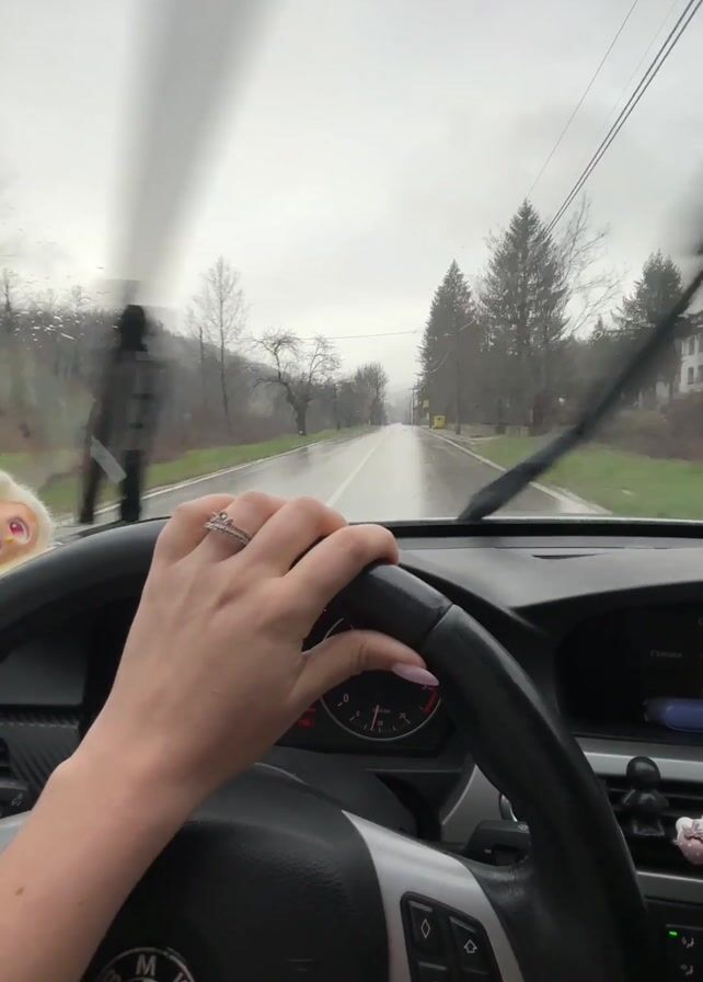 A woman drives a BMW on a wet road. Her left hand, adorned with a ring, grips the steering wheel. The windshield wipers are on. The weather is overcast. Trees and houses line the road. The car's dashboard and controls are visible.