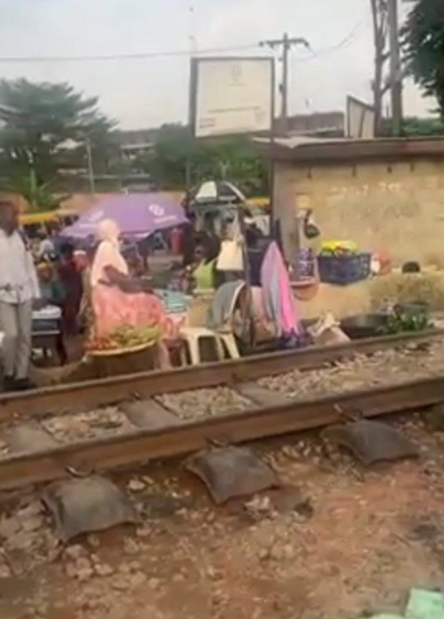 A camera films from the ground, showing a railroad track with a market set up alongside it. People are shopping and selling goods on the track. As the video continues, a green and white train labeled Nigerian Railway Corporation approaches. People around the tracks move away from the oncoming train, and the video ends.