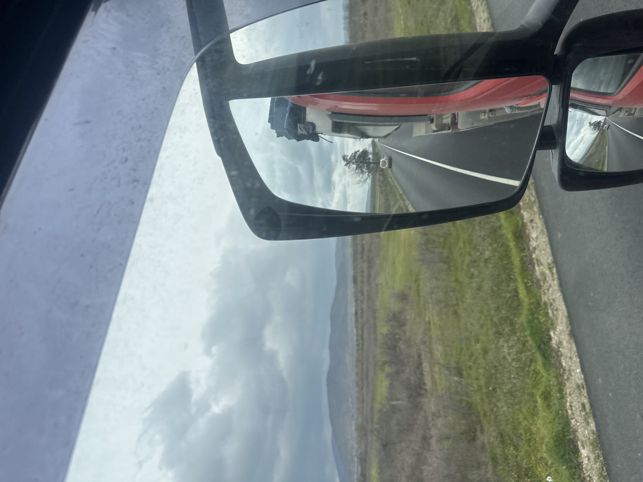 - "The image presents a view from the interior of a vehicle, specifically a large red truck, looking out through a partially obscured front passenger window and into its side mirrors" by FM-iMne13, licensed under CC BY 4.0