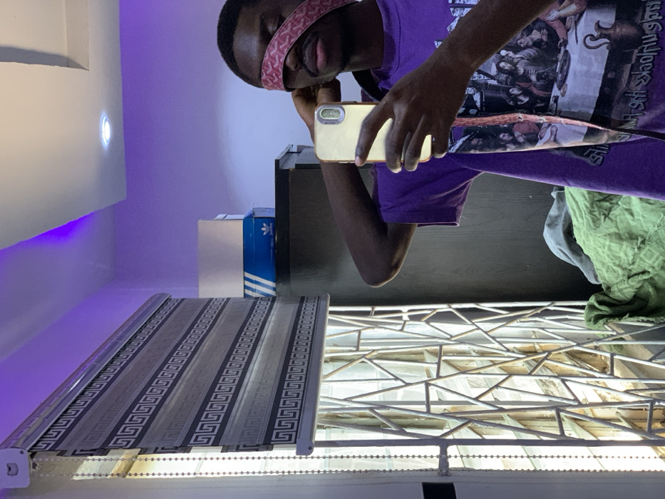 An indoor mirror selfie taken in a room located in Jos, Nigeria. The image features a young dark-skinned male in the foreground, holding a gold-colored smartphone in his left hand, angled to capture his reflection. A red and beige patterned fabric covers his eyes, obscuring his vision. He wears a purple t-shirt with a graphic print of "The Last Supper." His right arm is raised, with his hand positioned near the fabric covering his eyes. The background consists of a room with modern interior design. To the left, a window is visible, fitted with a geometric metal security grill and a black and grey striped roller blind featuring a Greek key pattern. A beaded pull chain for the blind hangs vertically. Above the window, purple LED strip lighting illuminates the ceiling, which also features a single recessed downlight and multi-level architectural details. On a dark piece of furniture, two shoeboxes are visible: one plain white and one blue Adidas box. Crumpled green and grey fabric rests beneath the furniture. The walls are light-colored.