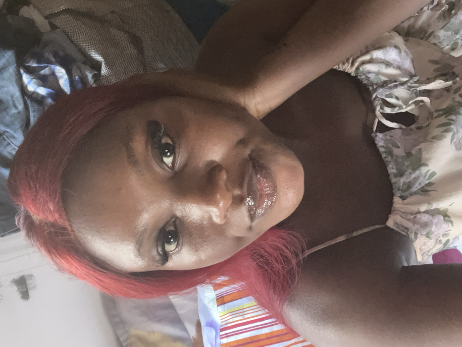 The image displays a head and upper torso shot of an adult female with dark skin, positioned in an indoor setting. She has red hair, dark eyes with prominent eyelashes, and glossy lips, exhibiting a slight smile while looking directly at the camera. Her left hand is resting against her jawline. She wears a light-colored top with a floral pattern (green and purple tones) and thin shoulder straps, featuring a drawstring detail at the chest. The background is blurred, showing indistinct light-colored, vertically striped fabric on the left and dark, crumpled fabric on the right, suggesting a casual indoor environment. The specific city location, Lugbe, Nigeria, cannot be confirmed from the visual evidence within the image.