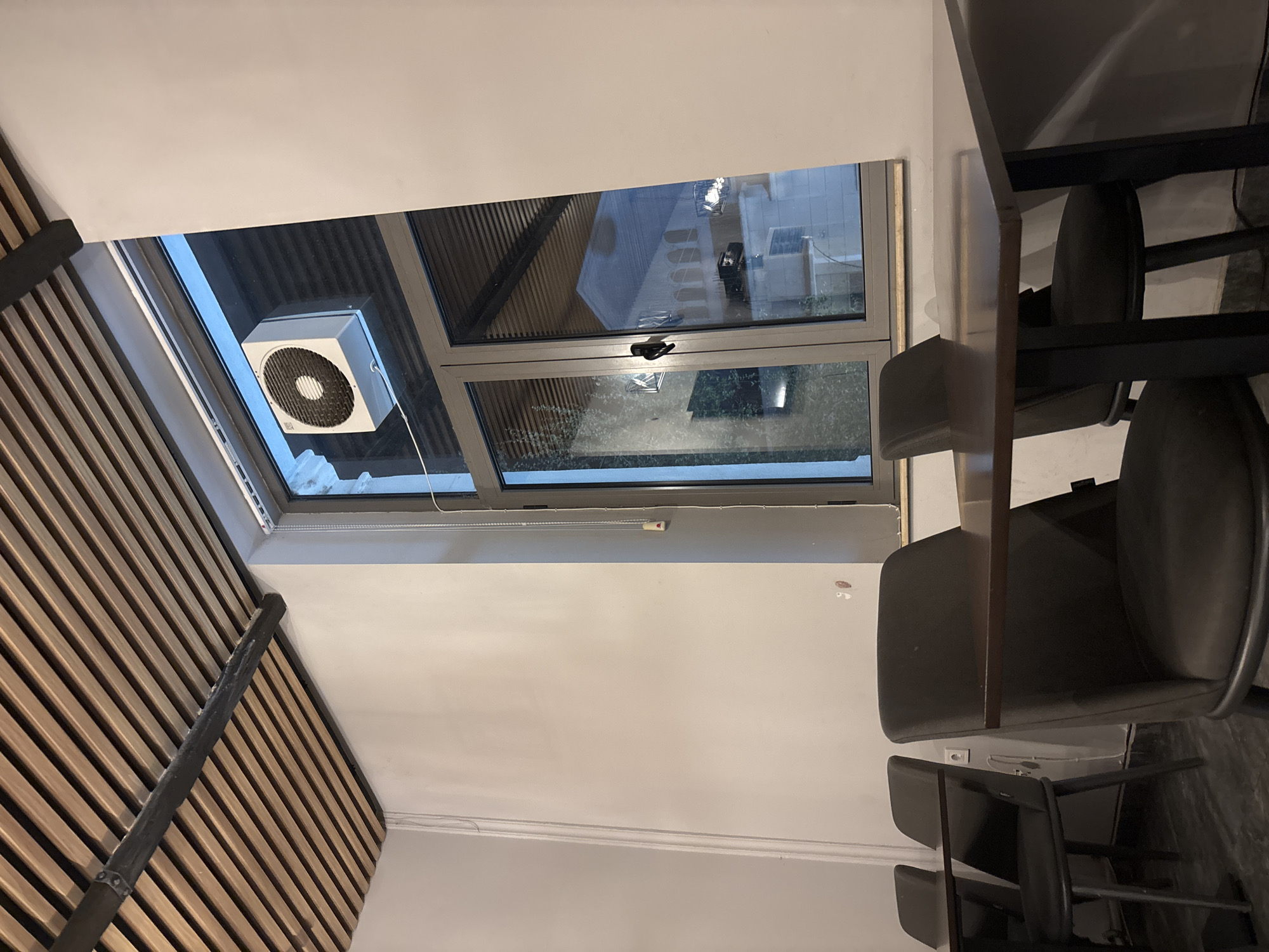 The scene appears to be an interior view of a building, likely in Plovdiv, Bulgaria. The room has a partially visible wall and a ceiling where light is coming through a large, possibly operable, skylight window. The skylight overlooks an external structure, potentially another building, along with vegetation. A white, cube-shaped air conditioning unit is mounted near the skylight. Adjacent to the window, there are wooden structures that could be part of a wall or architectural element. To the right, a modern dining set is visible, including a wooden table and several dark-colored chairs with metal frames. The chairs are partially obscured by the table, implying an active or staged dining arrangement. No people are visible in the image.