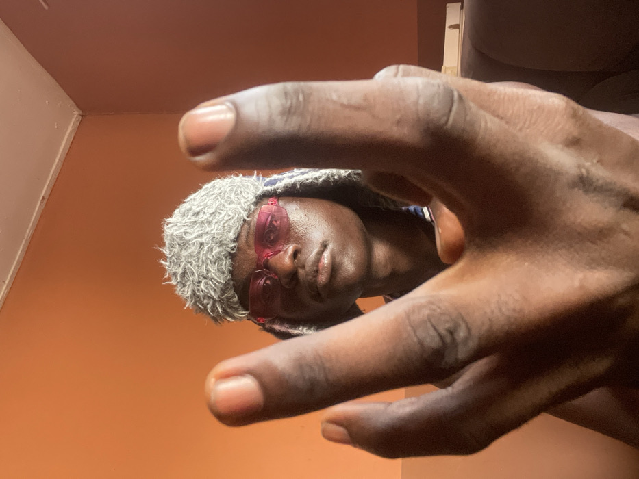 An individual, identified as male, is depicted in a close-up, low-angle portrait within an indoor location in Mosafejaw, Nigeria. The subject wears a grey, textured ear-flap hat and bright pink-tinted, narrow-frame sunglasses. His dark-toned face holds a neutral expression as he looks directly forward. A dark-skinned hand, presumably his own, is extended towards the camera in the immediate foreground, with the thumb, index, and middle fingers prominently displayed, partially obscuring his lower face. The background consists of a plain orange-brown wall, with a ceiling corner visible in the upper right. A segment of a dark brown upholstered furniture piece and a white horizontal trim are visible on the right side of the frame.