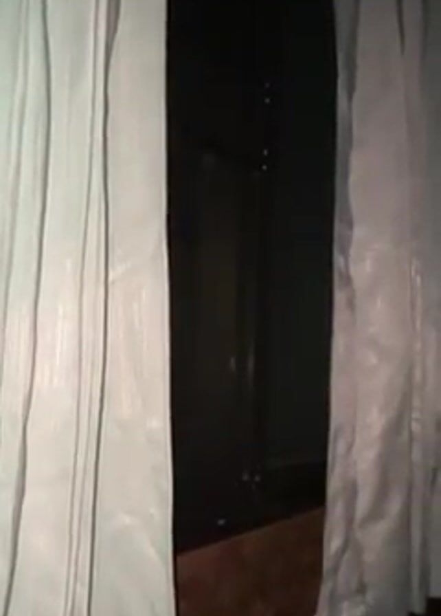 pair of white curtains slightly parted to reveal a dark interior. The floor appears to be made of brown tile. There is a sound of glass shattering.