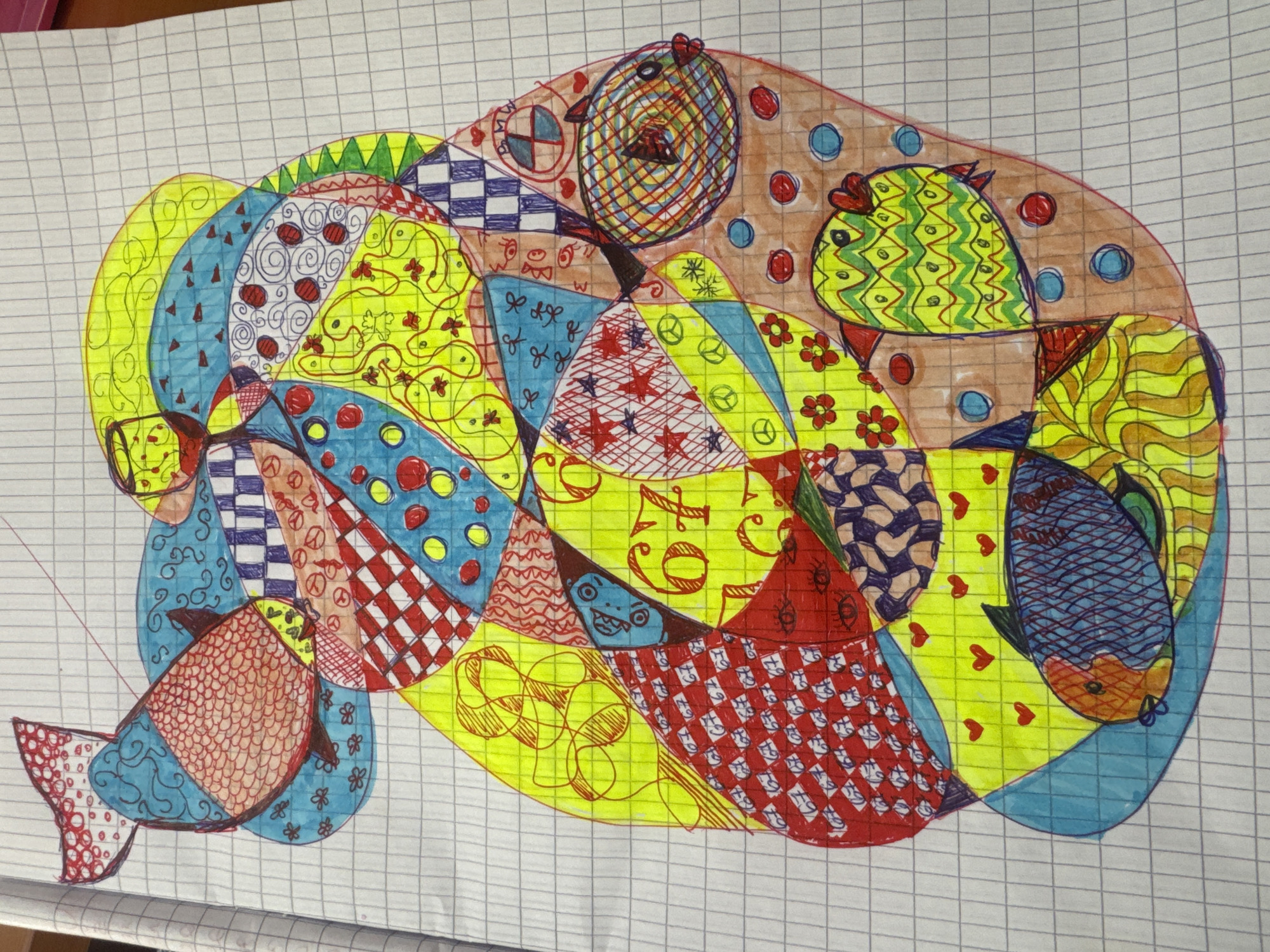 The image presents a vibrant, hand-drawn abstract artwork, contextualized by the request as originating from Dimitrovgrad, Bulgaria, though no geographical markers are visually discernible within the artwork itself. The drawing is rendered with colorful markers or pencils on a white sheet of graph paper, occupying the majority of the page. The central element is a large, irregular, vertically oriented shape, composed of numerous smaller, interconnected segments. These segments are filled with diverse patterns and motifs. Featured motifs include several stylized fish: a red-scaled fish with a blue patterned body and red-dotted tail at the top-left; a round, multi-colored fish with a red mouth near the mid-right, accompanied by a symbol resembling the BMW logo; a blue-scaled fish with an orange head and yellow fins at the bottom-left; and a green and yellow patterned fish with a red head at the bottom-right. Other prominent patterns consist of red and white checkerboards, blue and white checkerboards, red hearts on yellow backgrounds, red and blue stars, peace signs, floral designs, concentric circles, wavy lines, solid red and blue dots, and various geometric scribbles. The number '67' appears frequently, both as large yellow-filled numerals and repeatedly within a red and white checkered pattern. A stylized blue face and multiple sets of eyes are integrated into the design. The artwork is contained within the boundaries of the graph paper, with the grid lines visible as its background.