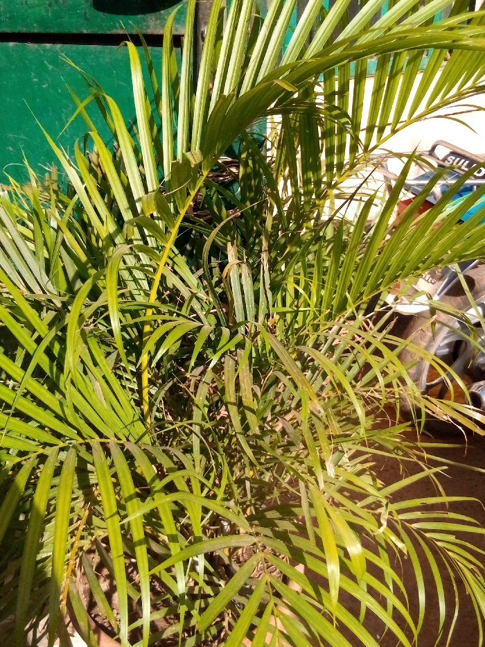 A vibrant palm plant with lush green fronds fills the frame. Its slender leaves radiate from the center, creating a dense canopy. Hints of yellowing suggest areas exposed to sunlight. The plant resides in a pot, visible at the bottom. The background includes a green surface and the partial view of a vehicle with text. The overall image captures the beauty and texture of this tropical plant.