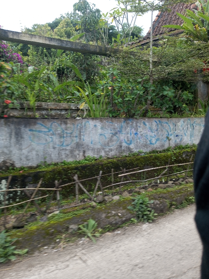 The image displays an outdoor scene in Cibodas, Indonesia. In the foreground, a gray paved surface, consistent with a road or path, is visible, partially obscured on the lower right by dark fabric. Above this, a weathered concrete retaining wall extends horizontally across the mid-ground, marked with several light blue graffiti tags. Below the main wall, a moss-covered concrete ledge is present, transitioning to a narrow, terraced garden bed. This lower bed contains sparse green vegetation and is bordered by a rudimentary fence composed of vertical and diagonal bamboo stakes interconnected by horizontal cords. Above the concrete wall, dense tropical vegetation dominates the background, featuring various green plants, broad-leafed specimens, shrubs with purple blooms, and several trees. A horizontal concrete beam is visible spanning above the vegetation. In the upper right background, a partial view of a building with a reddish-brown tiled roof is discernible amidst the foliage. The sky is overcast. No individuals are explicitly visible in the scene.