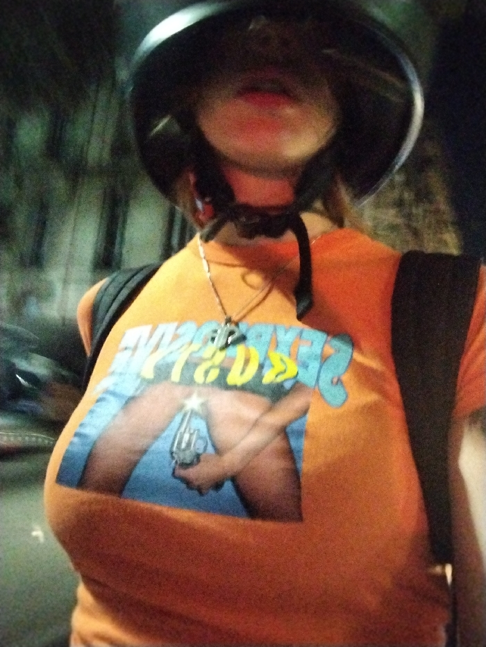 - "A person wearing a helmet and an orange t-shirt with a sexually suggestive image" by FM-ufozy1, licensed under CC BY 4.0