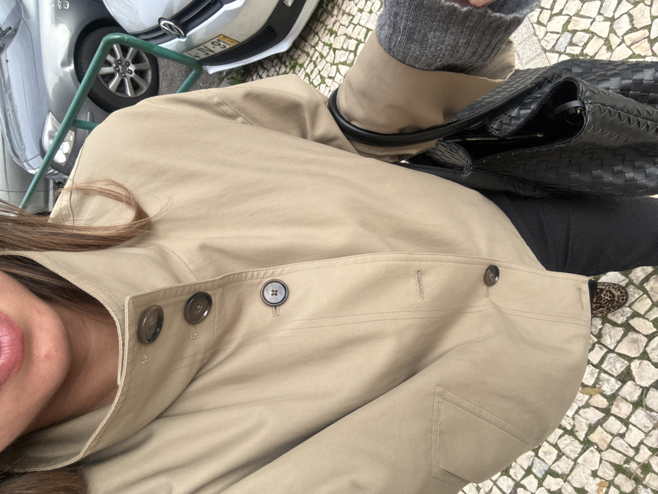 A close-up, downward-angled image captures an individual standing on a Portuguese calçada street in Almada, Portugal. The subject, largely cropped below the nose, wears a beige high-collar jacket with three visible dark buttons fastened on the front placket, and a fourth partially obscured. A dark grey knit cuff is visible extending from the right jacket sleeve. The individual wears black trousers and a single leopard-print flat shoe on the left foot. A black woven leather tote bag, with its interior partially visible, is carried on the right arm. In the background, behind a green metal barrier, are two parked vehicles: a grey car and a white car, possibly a Volkswagen, displaying a partial Portuguese license plate with the characters "J V 91".