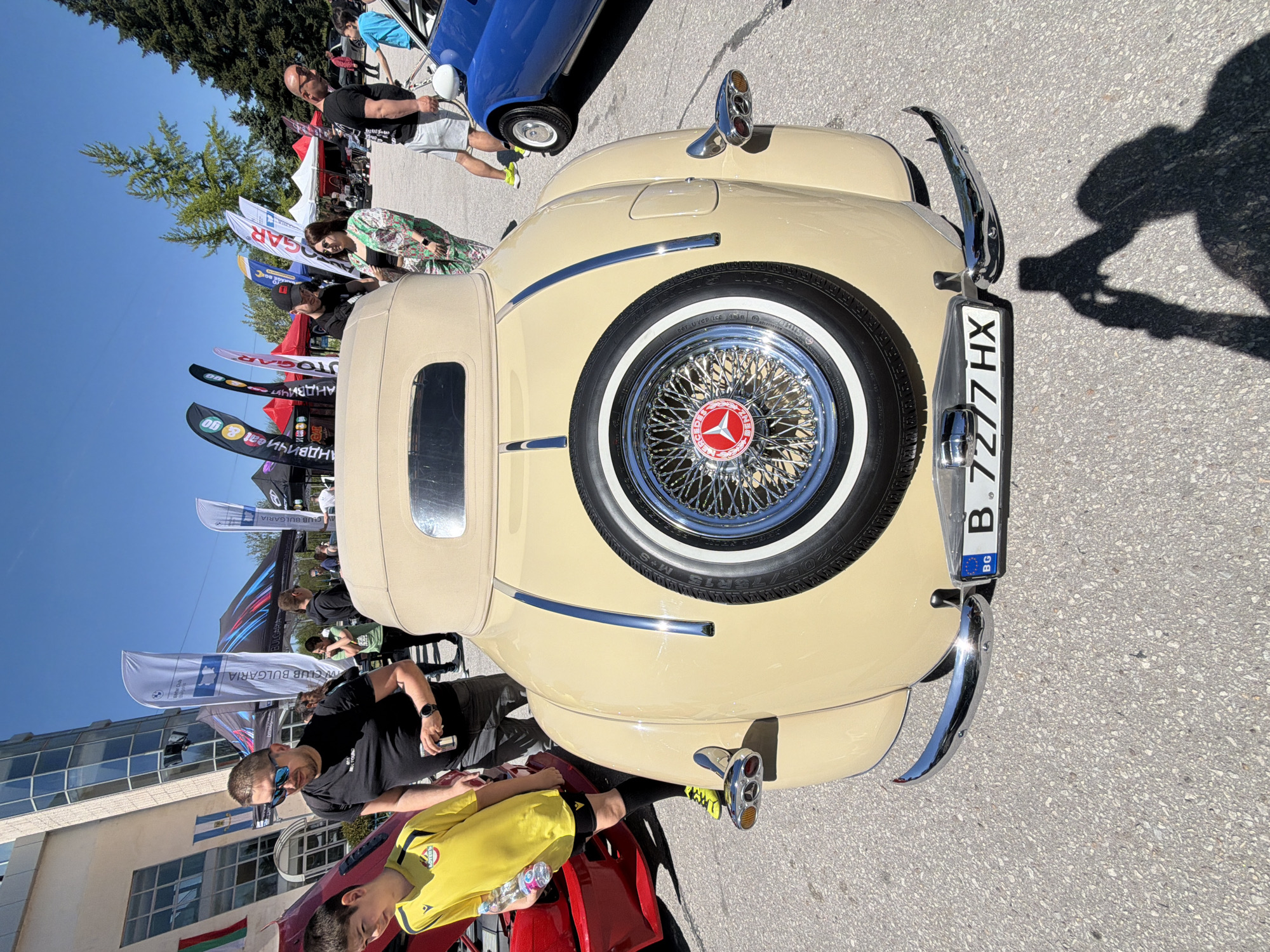 rear of a vintage cream-colored Mercedes-Benz car, likely from the 1930s, prominently featuring a spare tire mounted on the trunk with a chrome wire wheel and Mercedes-Benz logo in the center. The car has chrome bumpers and trim. The license plate reads "B.7277HX" and includes the "BG" country code, indicating Bulgaria. Several people are visible around the car, including a young boy wearing a yellow shirt, a man in a black shirt, and other blurred figures in the background. There are also several banners with logos on display. The setting appears to be a street in the city of Plovdiv, Bulgaria, with buildings and trees visible in the background. The scene suggests a vintage car show or gathering.