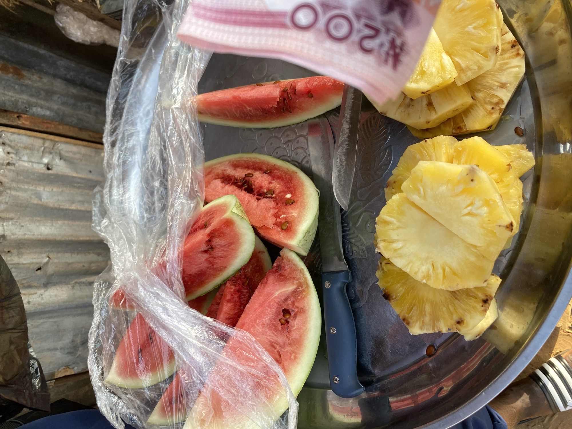 A street vendor's fruit display is observed in the city of Rido, Nigeria. The primary focus is a circular, reflective silver metal tray containing various cut fruits. The upper portion of the tray holds numerous triangular slices of red watermelon, many partially covered by a transparent plastic bag. A knife with a dark blue handle and a silver blade is positioned horizontally on the tray, separating the watermelon from several yellow pineapple slices arranged in the lower right. A Nigerian 200 Naira banknote is partially visible on the far right, held vertically. The background consists of weathered, corrugated metal sheeting, indicative of an outdoor market stall. A dark-skinned leg wearing a black and white striped slipper is partially visible at the bottom left.