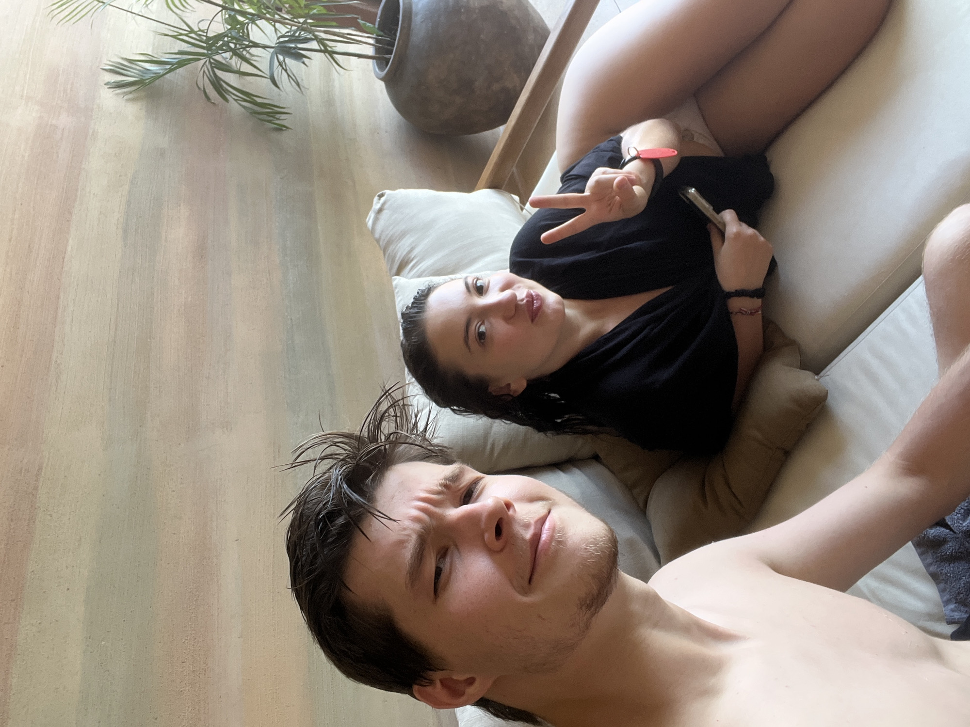 A low-angle selfie shows two people lying on a padded lounger in what appears to be an indoor setting in Pecatu, Indonesia. The flooring has a muted beige and tan vertical striped pattern. A potted plant with elongated green leaves is partially visible in the upper left corner of the frame. The pot is a large, rounded, matte gray vessel. A shirtless man with damp, dark hair occupies the lower portion of the frame, facing the camera with a slightly furrowed brow and a small amount of stubble. Above him and partially obscured is a woman in a dark top lying on her back. She is holding a phone in one hand and displaying a peace sign with the other. She also appears to have wet hair and is wearing a red wristband. The lounger has light-colored cushions and a wooden frame. The location is suggested to be Pecatu, Indonesia, likely indoors.