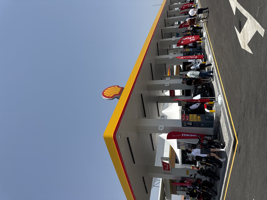 A Shell gas station with yellow and red trim stands under a blue sky. Multiple gas pumps are present, attended by people. Red flags with white text are attached to some pumps. Motorbikes are parked at the pumps closest to the foreground. White arrows are painted on the asphalt, directing traffic away from the pumps.