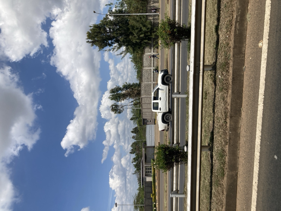 The image depicts a daytime outdoor scene in Theta ward, Kenya, focusing on a multi-lane road under a partially cloudy blue sky