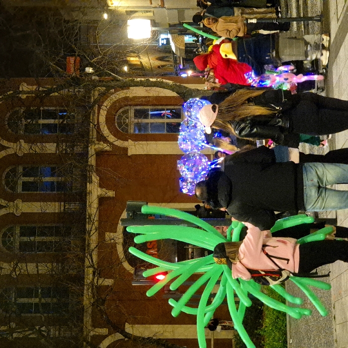 The image displays a nighttime street scene in Toulouse, France, specifically on or near Place d'Assézat. The background features a multi-story, reddish-brown building with cream-colored architectural trim, arched windows, and small balconies, characteristic of the Hôtel d'Assézat. Bare tree branches are visible in front of the building. In the foreground, a group of individuals occupies a paved urban area. A person with long hair, wearing a light pink hooded sweatshirt, a dark baseball cap, and a black backpack, is seen from behind carrying a large, bright green balloon sculpture composed of multiple elongated, curved sections. To their right, another individual, seen from behind, wears a dark winter jacket with a fur-lined hood and blue jeans. Further to the right, a woman with long hair, wearing a black leather jacket, dark pants, and a light pink baseball cap, also faces away. Numerous other individuals are visible in the midground and background, some holding translucent, spherical balloons filled with small, colorful LED lights, creating a luminous effect. One person wears a red hooded garment, and a child wears a dark jacket with a yellow hood. A red traffic signal is visible on the far left. Streetlights illuminate the scene, casting a warm glow on the surroundings. The overall atmosphere suggests a public gathering or event.