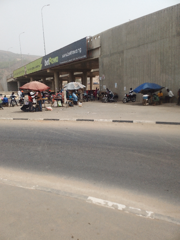 This image depicts a bustling roadside scene in Jiru, Nigeria, situated beneath a concrete overpass