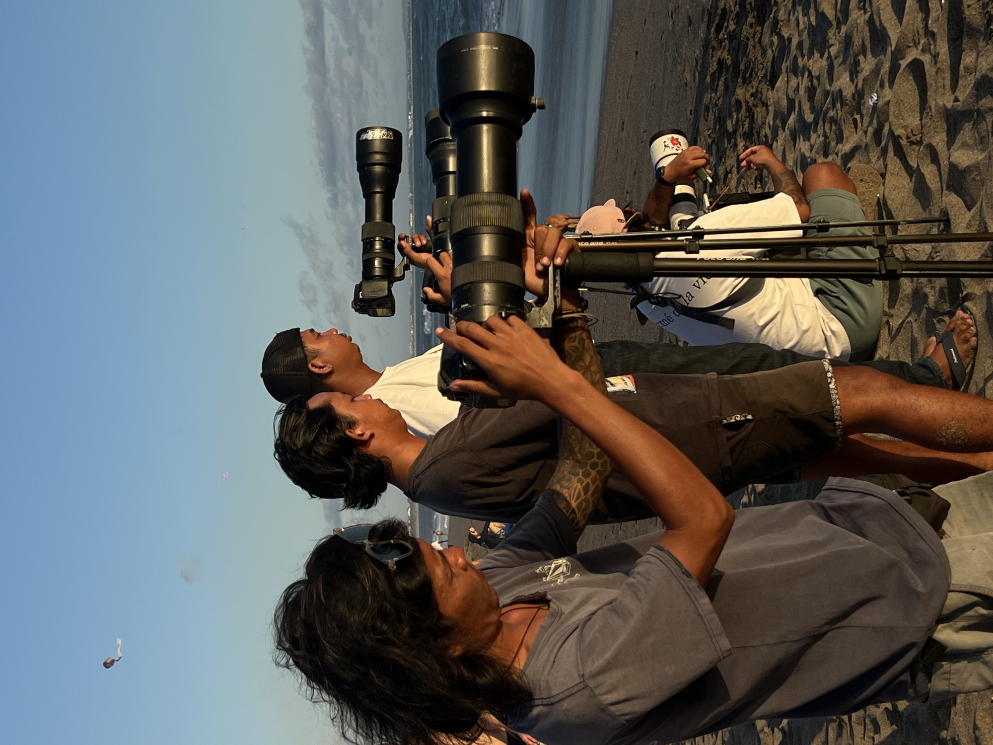 - "Three men lie prone on a sandy beach, each holding a large camera with a long telephoto lens pointed towards the sky" by FM-37mOy1, licensed under CC BY 4.0