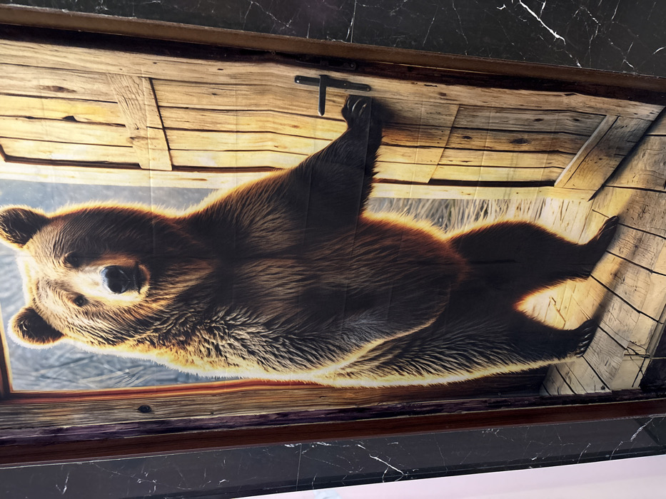 A large, vertically oriented graphic depicts a brown bear standing upright on its hind legs, facing forward. The bear's right forepaw is positioned on a dark, L-shaped handle of a rustic wooden door. The door, composed of vertical wooden planks, is slightly ajar, revealing a brightly lit, blurred outdoor background with foliage beyond. The bear stands on a wooden floor or threshold. The graphic itself exhibits creases and is mounted against a dark, marble-patterned wall, which is visible on both sides of the print. This scene is located in Tsovagyugh, Armenia.