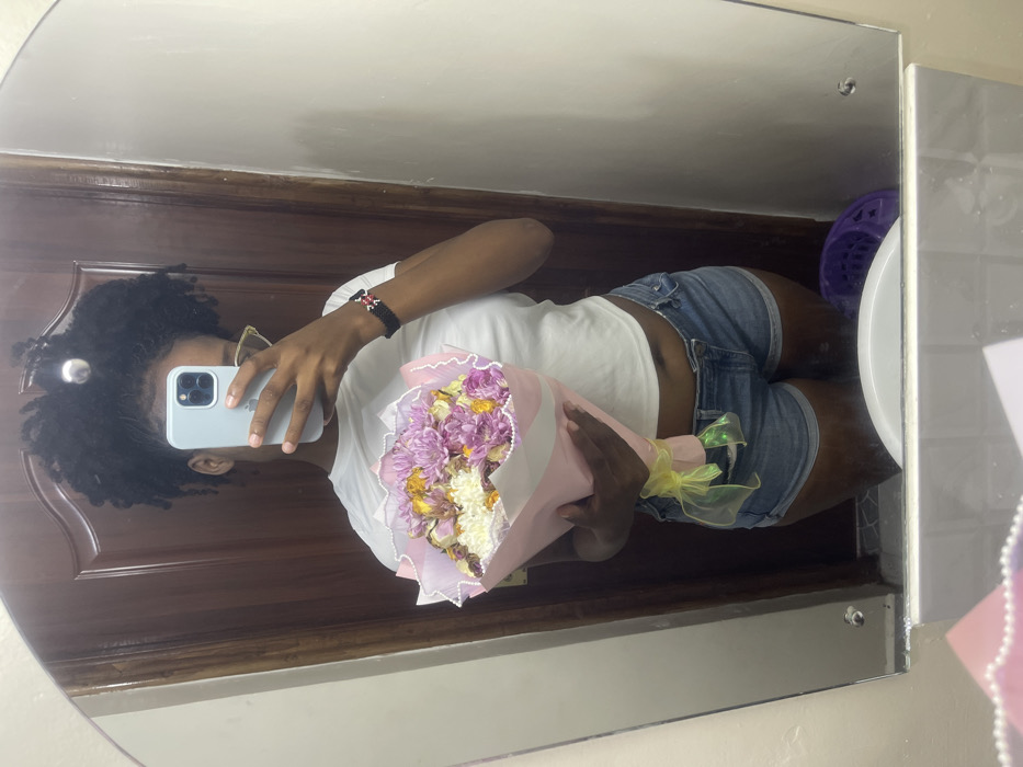 An individual is captured in a mirror selfie within an indoor environment in Thika, Kenya. The adult female subject, exhibiting dark skin and dark, curly hair secured with a silver spherical clip, holds a light blue smartphone in her right hand, positioned to photograph her reflection. Her face is largely obscured by the phone, though clear-framed glasses are visible. She wears a white crop top and blue denim shorts. A black beaded bracelet with red and white accents is present on her right wrist. In her left arm, she cradles a bouquet of flowers, predominantly purple chrysanthemums, white small blooms, and dried yellow flowers, wrapped in pink paper with a white ruffled, beaded trim and tied with a yellow translucent ribbon. The background, reflected in the oval mirror, consists of a dark brown paneled wooden door, light-colored walls, a white ceramic sink partially visible beneath the mirror, and a purple plastic container to the right of the sink. The setting is consistent with a private residential or commercial interior, likely a bathroom.