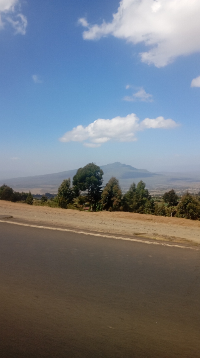 A scenic view features a road in the foreground, transitioning to a sandy shoulder. Beyond that, trees line the horizon with a distant mountain visible in the hazy background. The sky is a bright blue, dotted with scattered white clouds. The overall impression is that of a rural, elevated landscape under a clear sky.