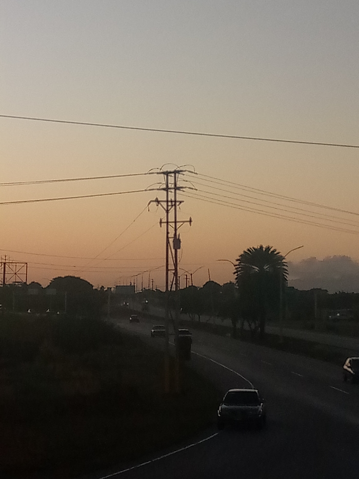 A road runs through a landscape under an orange-tinted sky. Utility poles with lines crisscross the top part of the frame. Cars can be seen traveling on the road. Some greenery and trees dot the roadside, including a palm tree. The overall scene is bathed in the soft, warm light of dawn or dusk. The image evokes a sense of calm and quiet movement.