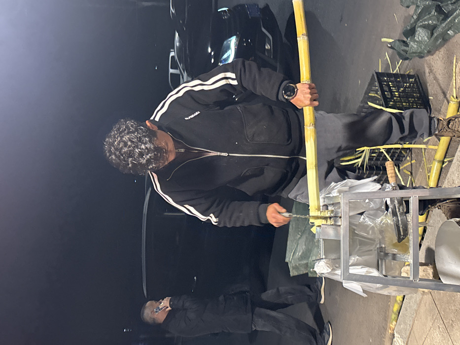 This image captures an outdoor street scene at night in Jiangjin, China. In the foreground, a male individual with dark, curly hair, wearing a black zip-up jacket with two white stripes on each sleeve, grey pants, and brown boots, operates a silver-colored, metal sugarcane processing machine. He holds a long, peeled, light-yellow sugarcane stalk with both hands, feeding one end into the machine's rollers. A smartwatch is visible on his left wrist. Discarded sugarcane stalks and fragments are present on the paved ground and within a black plastic crate situated to the right of the machine. To the left, in the mid-ground, a second male individual with short, grey hair, dressed in dark attire, walks from left to right while conversing on a white mobile phone held to his right ear. Dark-colored vehicles are parked or in motion in the background, illuminated by artificial light sources. A dark green tarp or bag is visible on the ground to the left of the sugarcane machine.