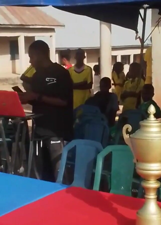 Two trophies are displayed on a red tablecloth. Behind them is a white building with a window and people visible. The event appears to be outdoors under a blue tent or canopy. The camera pans to show a man standing behind a table with a laptop and other equipment. A red motorcycle is parked behind him, and more people are standing around. Some are wearing yellow shirts. There are stacks of green chairs nearby. The setting looks like a casual outdoor gathering.