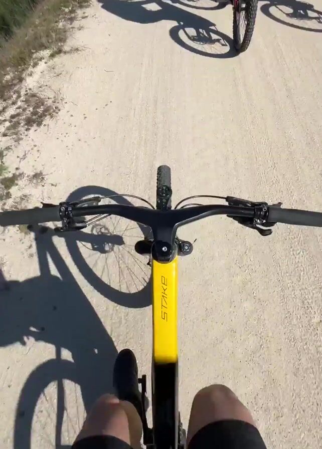 Three people are biking on a dirt road. The person recording is riding a yellow "STAKE" mountain bike. The other two bikers are riding ahead. The biker in the back is wearing a navy blue hooded sweatshirt and red shorts. The biker in the middle is wearing a black shirt and shorts. The road is surrounded by trees and shrubs. The sky is blue. At one point, the recording biker takes a selfie, giving a thumbs up while wearing an orange and black biking shirt.
