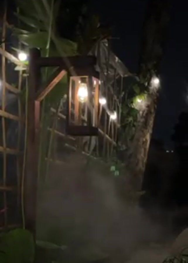 The video depicts a nighttime scene with a wooden lantern suspended from a wooden post. The lantern is illuminated, casting a warm glow. A string of small, round lights is visible in the background, entwined among foliage and a bamboo structure. A fine mist or fog drifts across the ground, partially obscuring the plants and creating a hazy atmosphere. The surrounding vegetation includes banana leaves and a tree trunk. The overall impression is one of a decorative and tranquil outdoor setting.
