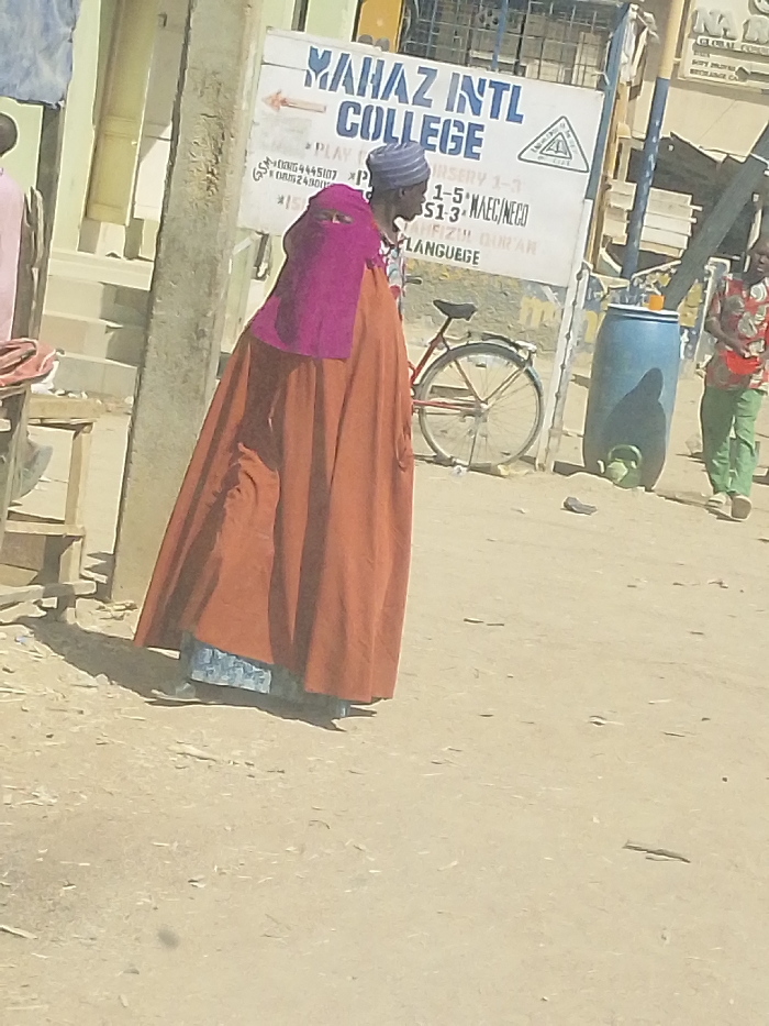 The image displays an outdoor street scene in Hotoro North, Nigeria, under bright daylight. In the foreground-midground, a person stands facing right, attired in a long, reddish-brown outer garment over a patterned blue and white lower garment, with a purple head covering and a purple face veil obscuring the face. To the left of this individual, a partial view of a wooden stool or small table is visible, alongside a vertical concrete or utility pole. In the mid-background, a prominent white sign with blue text reads "MAHAZ INT'L COLLEGE," accompanied by an arrow pointing left and a triangular logo. Additional text below includes "PLAY GROUP," "NURSERY 1-3," "MAEC/NECO," "QUR'AN," and "LANGUAGE." A red bicycle is parked near the base of this sign. Further to the right, a large blue plastic barrel stands upright on the ground, featuring an orange cap or object on its top. On the right side of the frame, a second person walks towards the right, wearing a multicolored patterned short-sleeved shirt, light green trousers, and holding a red object. A third person is partially visible on the far left edge of the frame. The ground throughout the scene is unpaved and appears dusty or sandy.