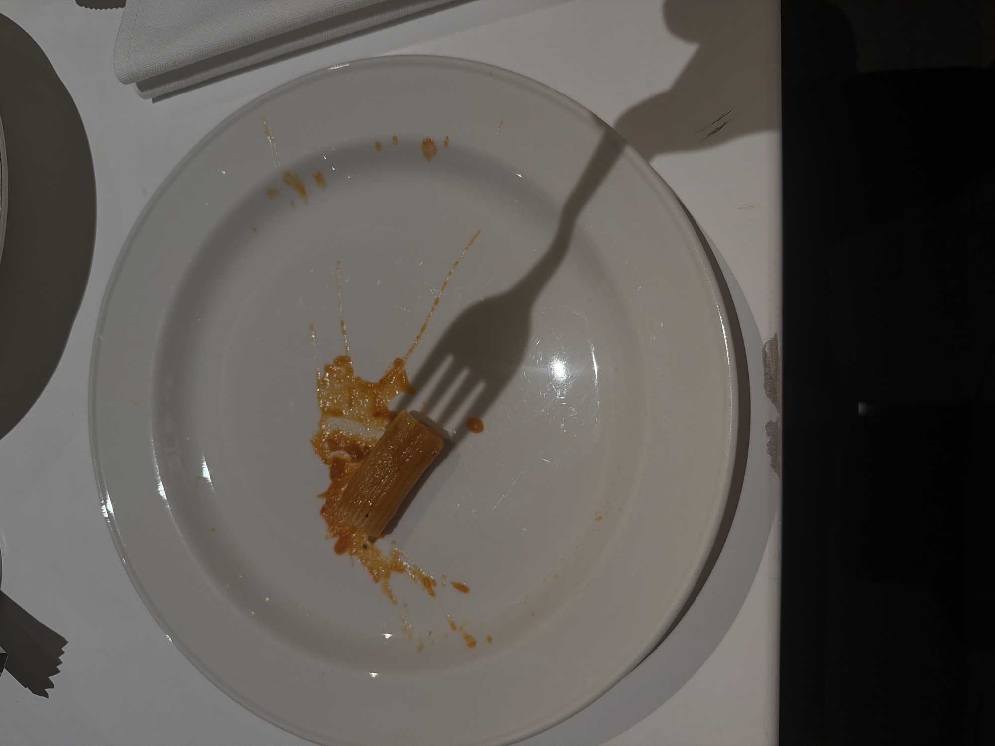 The image presents a high-angle, close-up view of a white, round ceramic dinner plate situated on a light-colored table surface, indicative of an indoor dining environment. The plate is largely cleared of food, showing only scattered streaks and splatters of an orange-red sauce, consistent with a tomato-based pasta sauce. A single, tubular pasta noodle, appearing to be rigatoni, partially coated in the same sauce, rests slightly off-center on the plate. The distinct shadow of a four-tined fork is cast diagonally across the plate, originating from the lower right quadrant. To the upper right of the plate, a folded white cloth napkin is visible on the table. The lower portion of the frame shows a dark, undifferentiated area beneath the table. No people are present. The image contains no visual identifiers to confirm its specific geographic location as Yerevan, Armenia.