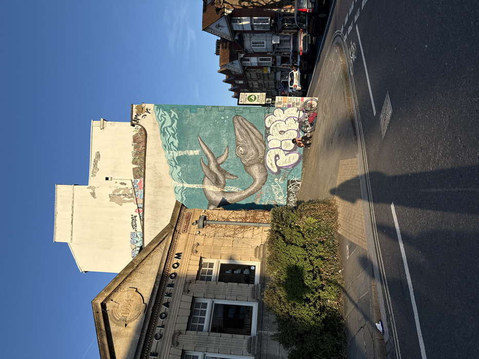 This image captures a street scene at the junction of Woodland Road and Park Row in Bristol, United Kingdom, under a clear blue sky, with lighting indicative of late afternoon or early morning due to long shadows. On the left, a prominent stone-clad building, identified by the carved inscription "THE CLOAKROOM" and the date "1904" on its pediment, features classical architectural elements including columns and large windows. A dense green hedge borders the pavement in front of this building. To the right of "The Cloakroom," a taller, lighter-colored building stands, its lower section adorned with a large street art mural. The mural depicts a stylized grey aquatic creature resembling a plesiosaur, with a large eye and an elongated neck, alongside a tentacled appendage, all set against a teal-blue background with wavy patterns. Below the mural, purple and white graffiti spells "PINK," accompanied by other illegible tags. The upper parts of this building show signs of wear with peeling paint and additional graffiti. On the pavement beneath the mural, a single individual sits, clad in dark attire and wearing a helmet, appearing to interact with a small object. Two bicycles, one red and one purple, are parked adjacent to this person. The street, a two-lane asphalt road with double yellow lines and a solid white line, curves to the right, leading past a row of traditional terraced houses with pitched roofs and bay windows. Several vehicles, including parked cars and cars in traffic, are visible on this street. Traffic signs, including "Clean Air Zone" and "20mph Zone," are present on the right-hand pavement. Two long, dark human shadows are cast across the asphalt in the foreground, extending from the bottom center towards the upper left, indicating the position of the photographer and at least one other person.