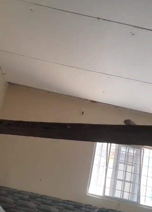 The camera focuses on the ceiling of a room under construction. The ceiling is made of white tiles, and there is a dark wooden beam running across the middle of the shot. Below the beam, a window with metal bars is visible. The walls are painted a light color, and there is gray tiling near the floor. The sound of music plays in the background.