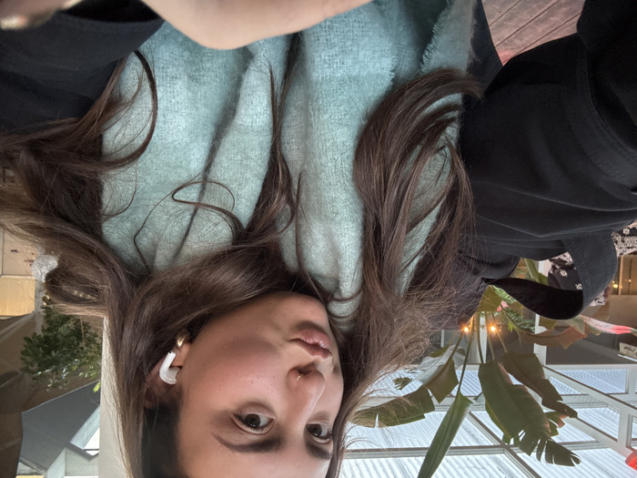 A close-up selfie features a young adult female with long, dark brown hair, wearing a light blue textured scarf and a dark top. She is looking directly at the camera with her lips puckered, and has a gold hoop earring in each ear, a nose ring in her left nostril, and a white AirPod Pro in her right ear. The background reveals a conservatory-like setting with a corrugated translucent roof and white metal framing. Lush green plants, including large-leafed tropical foliage, and decorative string lights with warm yellow bulbs are visible, suggesting an indoor-outdoor cafe or restaurant environment in Tel Aviv, Israel.