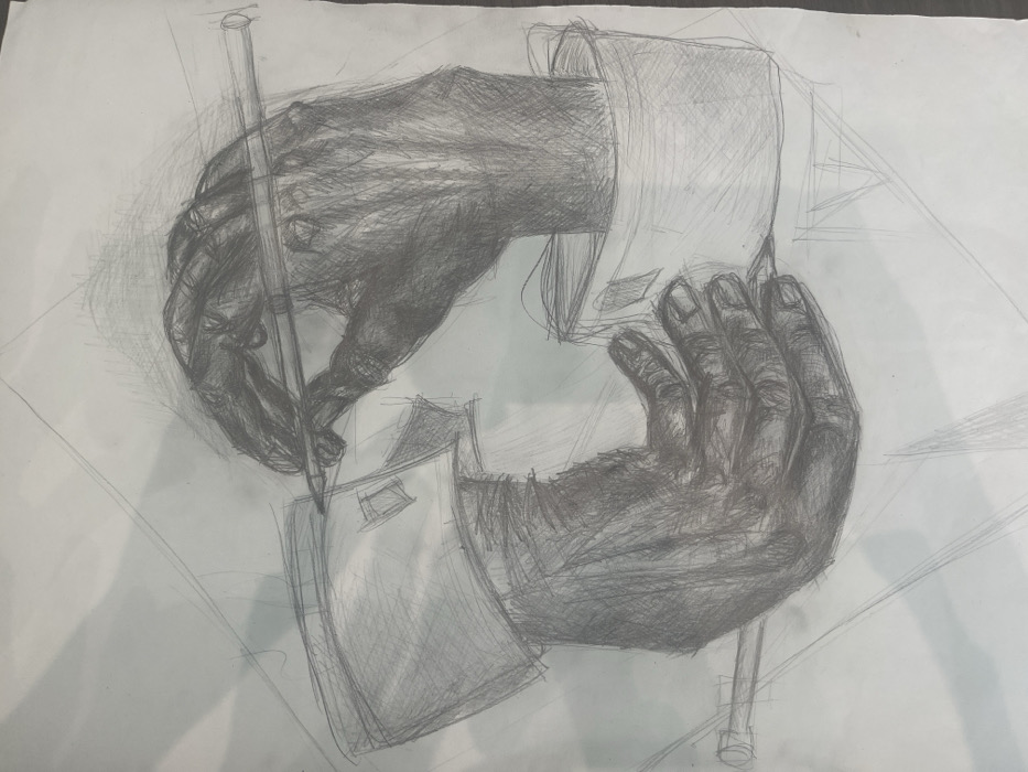 This image is a pencil sketch on white paper, depicting a study of hands