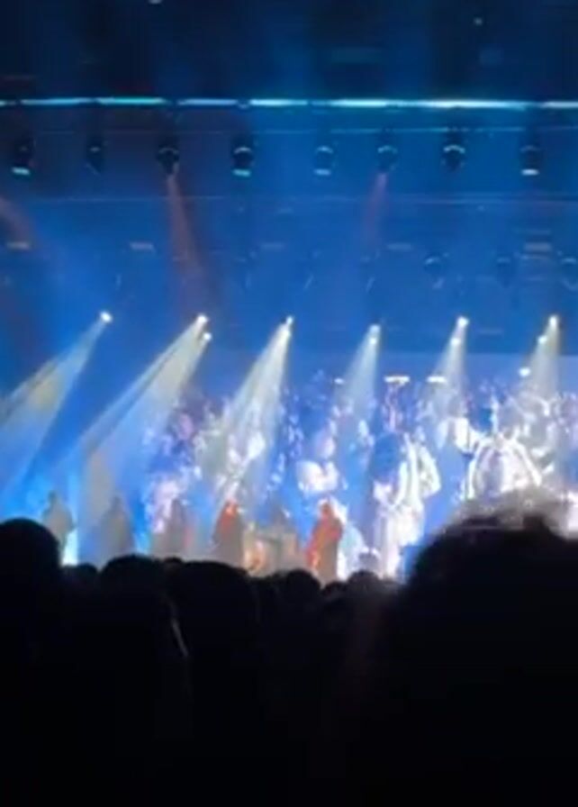 A live concert is taking place. The audience is dark and out of focus. The stage is well lit with multiple white beams of light projecting outward. A group of musicians and singers are performing on stage. A large screen behind them is showing a crowd of people.