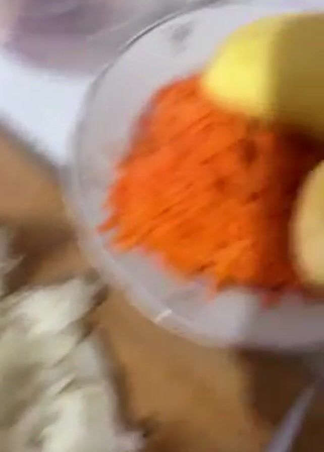 ingredients for a meal being prepared. First, there is a close-up of a pile of chopped white onions on a wooden cutting board. Next, the camera pans to a white plate containing shredded orange carrots and two peeled yellow potatoes. Finally, a container of raw red meat soaking in water is shown. The background suggests a kitchen setting.