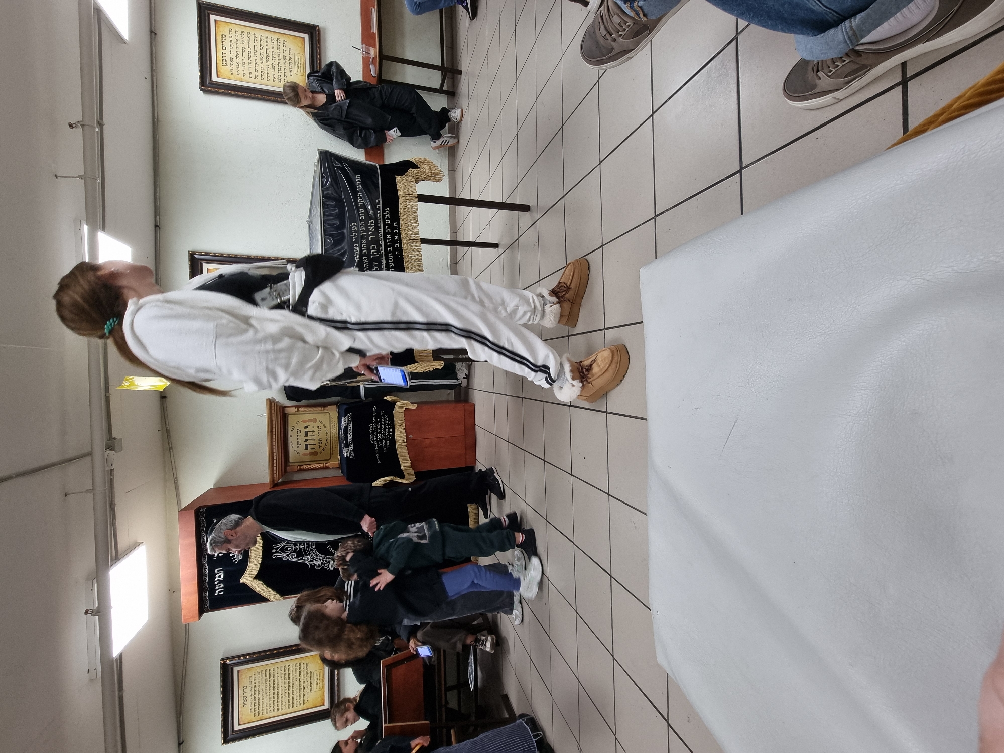 This indoor scene depicts people gathered in what appears to be a synagogue or a similar religious setting. The environment includes tiled flooring, framed texts or plaques on the walls (possibly in Hebrew), and furniture such as benches. Several people are present: * A woman in a white tracksuit is looking toward a covered religious structure or reading desk, holding a phone or similar device. * Other individuals, including children, are standing or interacting near the religious structure. * A man in a black coat is standing close to the religious structure looking at the other children. * Some people are seated or kneeling, possibly engaged in prayer or study. The scene appears to be capturing a moment of religious observation, prayer, or learning. Given the Hebrew text on the wall and religious context, it seems this scene might take place at Tel-Aviv.