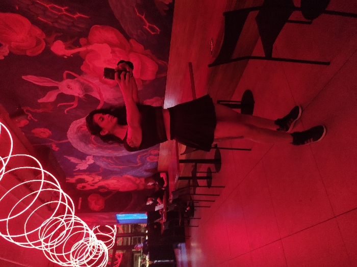 A woman in a black outfit holds a phone, presumably taking a photo of a colorful mural on the ceiling featuring a rabbit and other figures. A neon light art installation of concentric circles hangs nearby. The background appears to be a bar or club with high-top tables and chairs, illuminated with red lighting.
