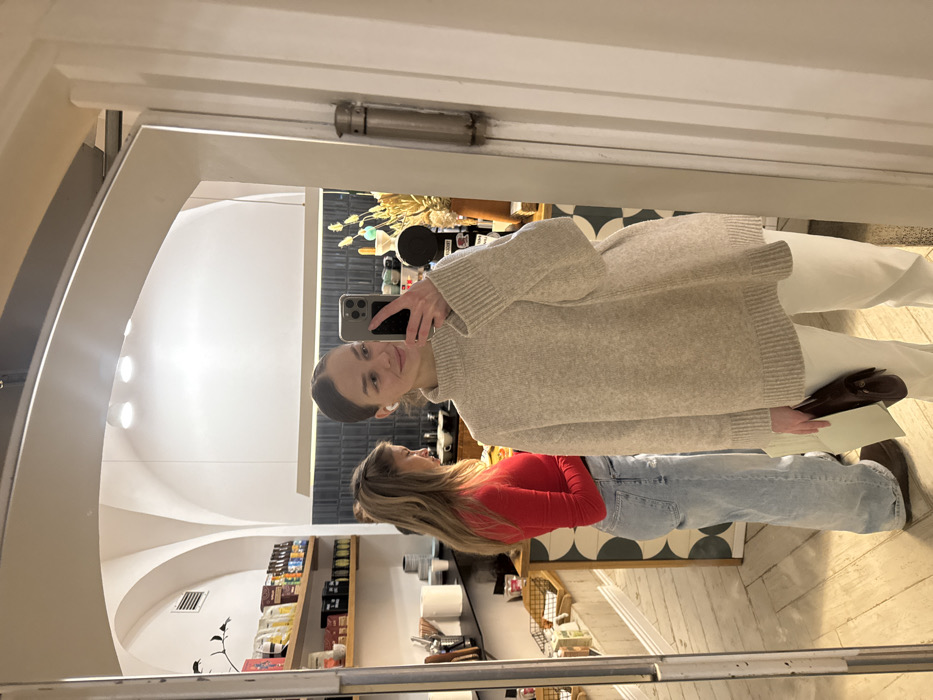 A woman in a beige sweater and white pants takes a mirror selfie